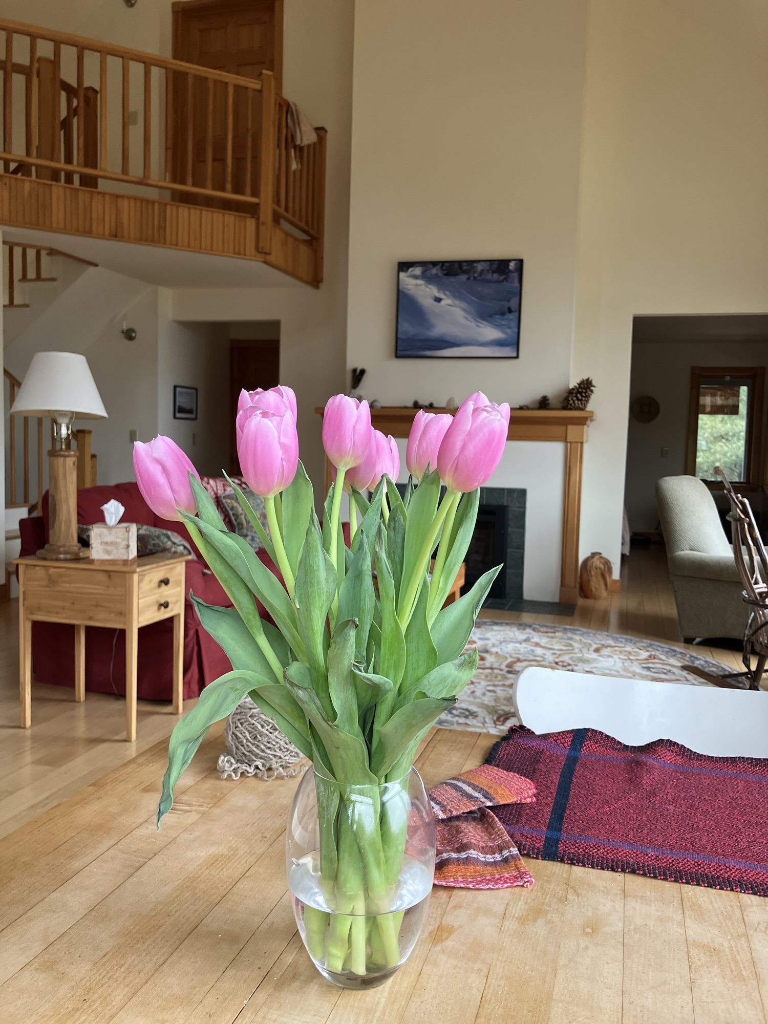 This was another surprise. I sent this photo of pretty spring tulips to my daughter. She questioned where I bought the huge flowers. To her, they looked like they were sitting on the floor. But apparently our butcher block table looks exactly like our floor and was lined up perfectly so one cannot see where the table ends and the floor begins.