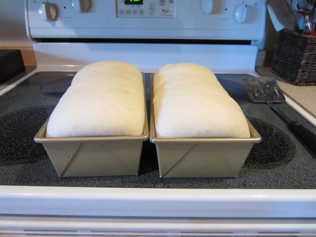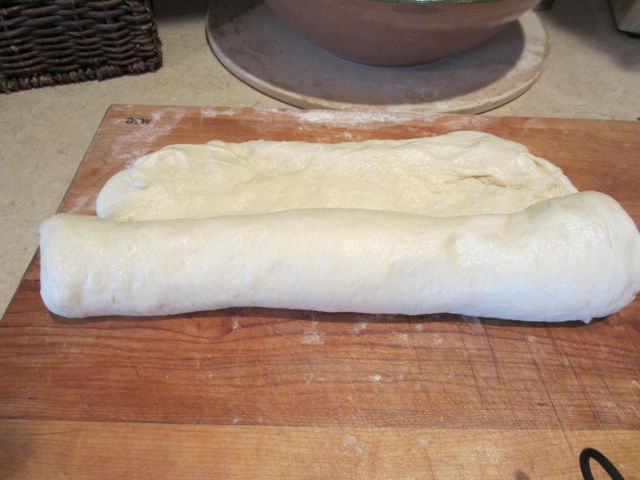 After the dough has risen in the bowl, you divide it in two and pat each portion into a rectangle. Then roll it up, pinch the ends and put them in the oiled pans to let them rise. That’s it. Nothing beats the smell of fresh baked bread. Bread machines create the same fresh baked smell but the loaves are awkward and small. There’s something magical about working with your hands and yeast to create something so delicious.