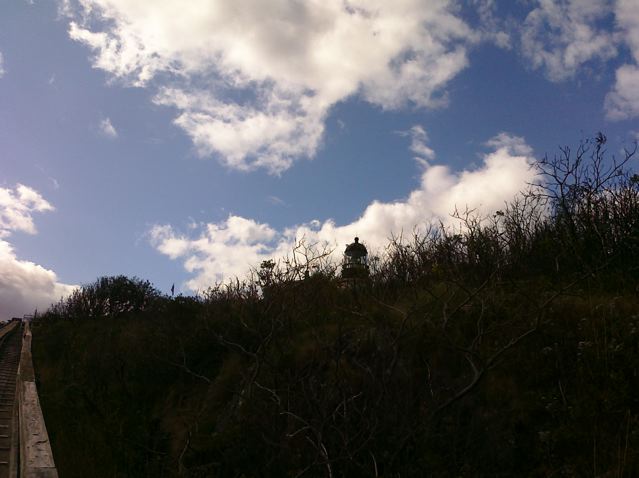 A cold, high pressure system blew the fog away today. The wind was dry and from the north, so Tim headed out to one trail to work and I went to another with our respective weed whackers, more delicately called whipper snippers in Australia. He had the good sense to get back to the house when a rain squall blew by. I saw it and thought it would just pass. Well it did pass but not before it soaked me and with cold, wind-driven rain and hail. Back at the house, I caught a rainbow in the storm’s wake, which had hardly any arch and was almost flat along the water.