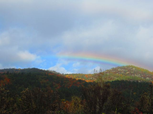 Rainbows are magical. They occur when there’s a combination of moisture, in the form of fog or rain, and sun. They are fleeting and elusive. If you don’t look for them, you might miss them. This one was spotted when we left home this morning from our road. For a moment it touched both hills, but I am hiding that photo.