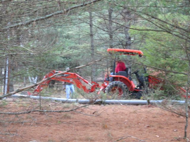 Well not exactly but the first cut of the 577 foot ditch needed to bury our power lines in was significant. We rented heavy equipment and used a lot of elbow and back grease. A bulldozer(?) was delivered and Tim’s brother arrived to operate it. We had to watch out for various hazards: an underground spring’s pipe, steep grades and a lost mole.