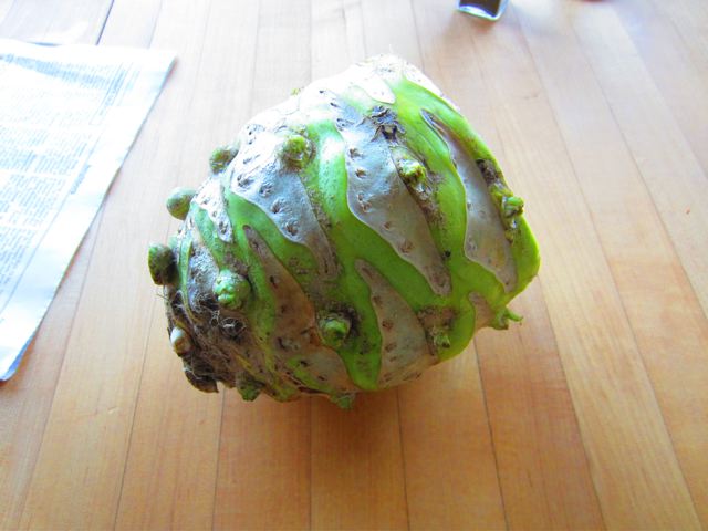 This kohlrabi is huge, bigger than a grapefruit, smaller than a breadbox. Apparently you just carve a little off as needed. i’ve made a slaw with apples and craisins two nights and have hardly made a dent in it.