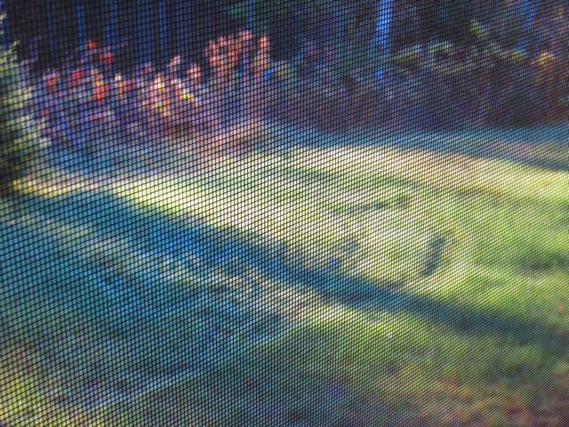 The first photo is very shady because I didn’t even take the screen out of the window to shoot it but something strange is going on. We awaken to various crop circles. This was the first and the pattern gets lost behind the screen. it suggests something either skulked around in random circles or it was dragged.