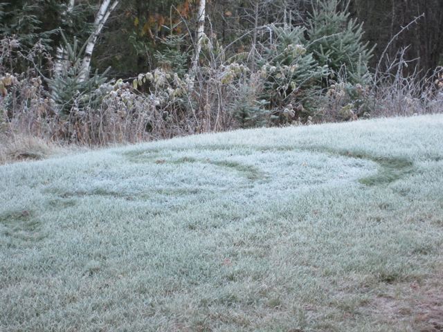 porcupine crawling around eating grass???(that’s jimmy’s guess)his body would be close to the ground and his quills would press the grass flat and clear the frost off the grass…….my first guess was that was where gary drove the tractor and it crushed the grass but it only showed up so well after the frost was on the ground??