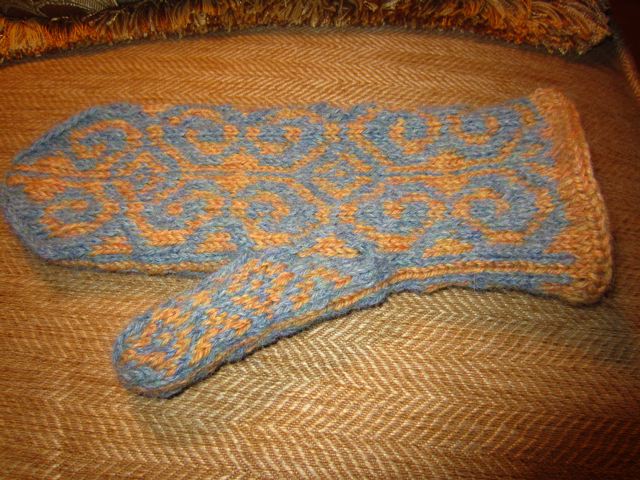 I have wanted to knit these mittens for a couple of years and now my daughter and her friends (well actually my daughter, on behalf of her friends) has requested knitwear. Here’s one of two Fiddlehead mittens, knit but not blocked or lined. Great pattern. I’ve tried to design my own colorwork pieces before but didn’t pay enough attention to the details of what happened when the thumb grew or the mitten decreased. Plus I have a better idea of the right yarn for projects, DK or light worsted, my heavier handspun is homey but not as pretty. And now, I always check gauge.
