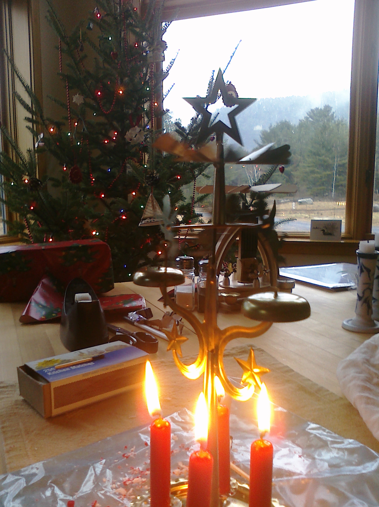 It’s beginning to look a lot like Christmas, everywhere I go. Especially since my everywhere includes the bedroom, where an amarylis is growing and the living dining area, where the tree is up and decorated and my little swirling candles and chimes are up. Tim put the tree up and hung the lights then I tossed what I could from a relatively standing position. I put together and cleaned my little angel chimes and am always amazed at how flimsy they are. Today I tried to find a replacement but apparently it’s difficult. The original company went out of business when the market was flooded with cheap imitations from China and now supposedly the production has moved to Turkey, but I am dubious. They are very sweet because when the air heats up from the candle flames, the angels spin around and ring the brass bells. I bought a much more substantial version this year from Germany made of wood. But alas there’s no sound. There are instead, choir angels who circle around a pipe organ and it is so authentic that the sheet music is actually a traditional carol.