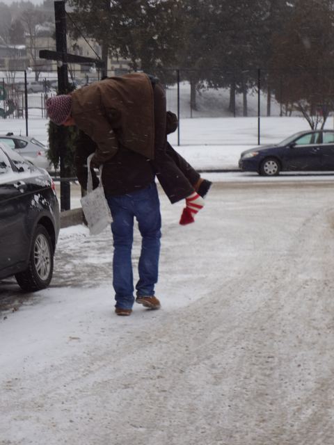 By including this photo, I think I prove I have no pride. That’s me, after a slip on the ice, on the shoulders of my son. I even lost my cast cozy for a moment, phew!