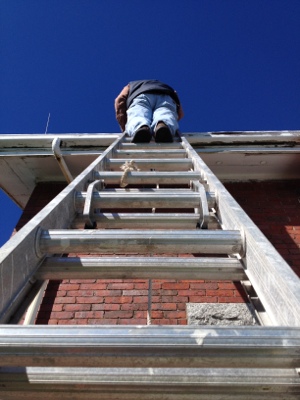 That’s Tim above. What you don’t see is me standing on the bottom of the ladder serving as ballast in the gusty breeze. Very important work.