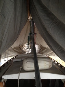 It takes a full size ladder to reach the deck because it has a five foot, fin keel. Our mission was to cover the boat with an oiled canvas tarp, which seemed to weigh just under a ton!