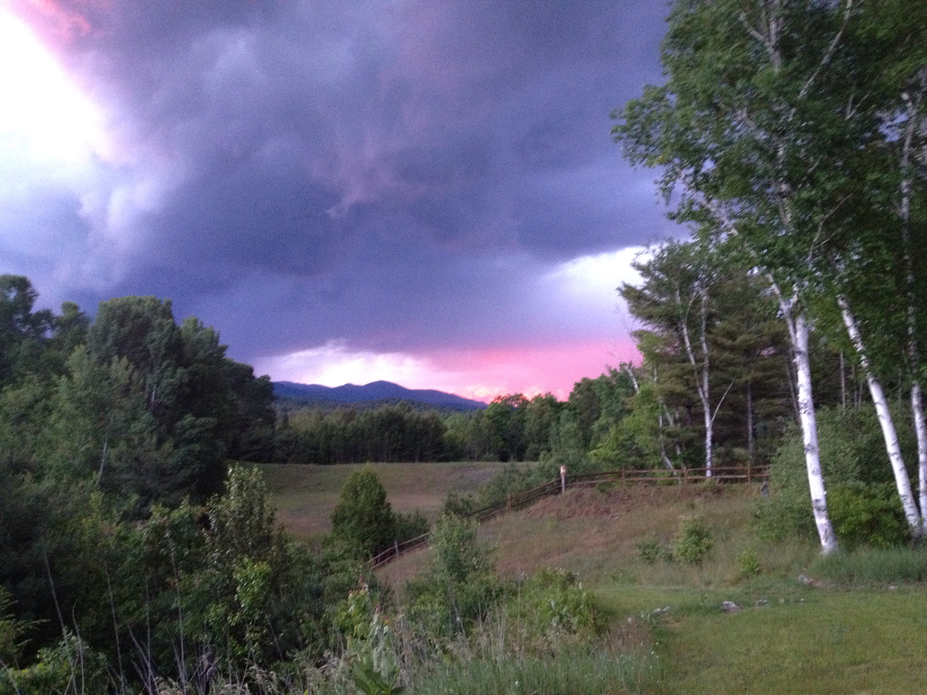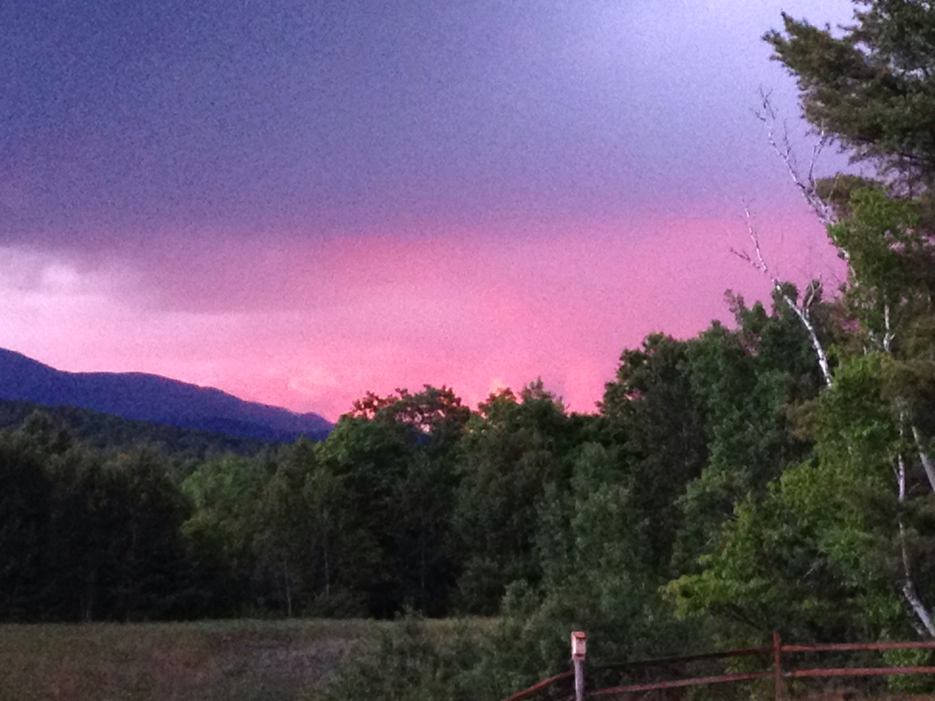 Tonight, pink clouds formed over the mountains, followed by lightning and gravel sized hail.