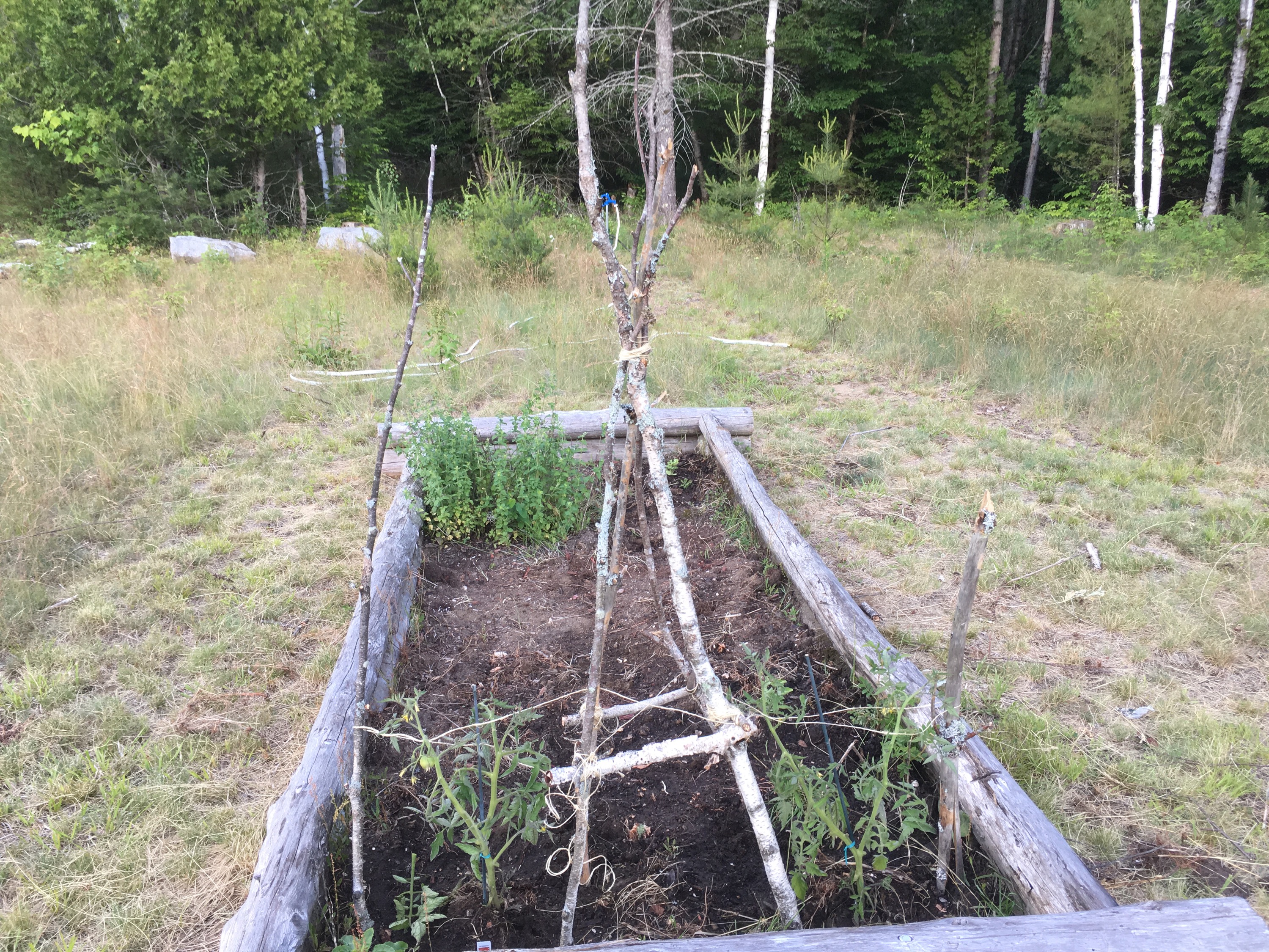 I needed some supports for my garden and sort of wove a twig tuteur. I decided two would dominate the raised bed so one sits between the tomato plants.