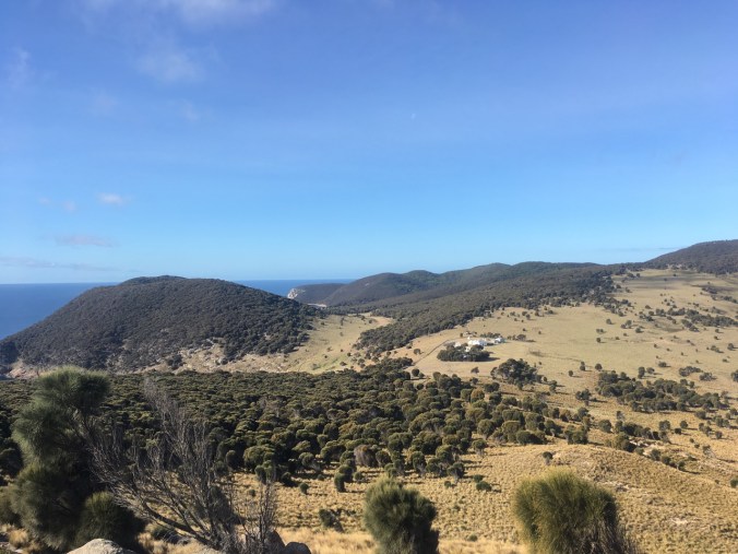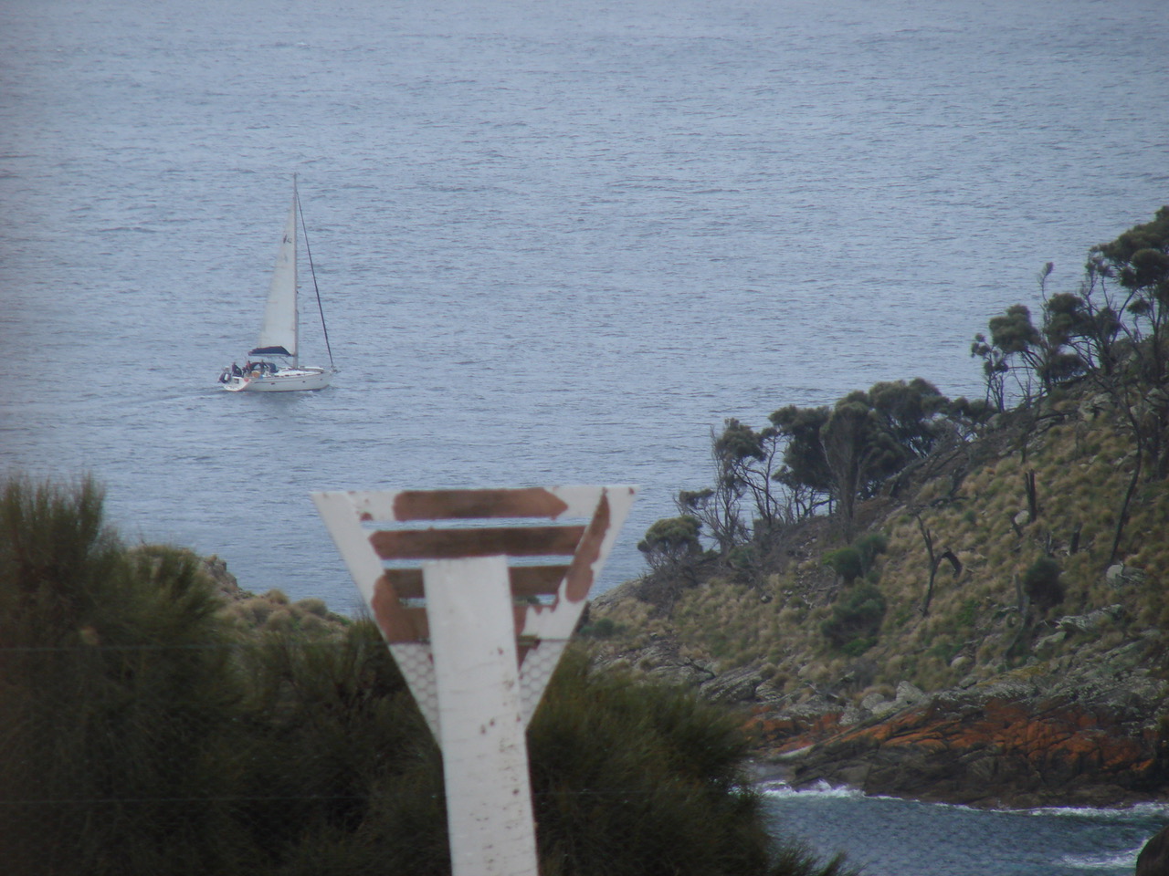 I never tire of this view of the compound from Barn Hill. The cluster of buildings is the compound, which includes the Museum in the former superintendent’s house, the workshop/garage, fuel, generator and radio sheds and the garden. Our house is surrounded by the trees which serve as a much needed wind break. Weather has been mostly fine, although I don’t see that term used in the weather report lately. We had a good downpour two days ago.Yesterday misted on and off as the clouds drifted by but we both went swimming in Garden Cove, a beautiful cliff lined beach, after we finished some projects around the house. We had seen some red jelly fish last week but they seem to have drifted away. Boaters reported they only had a mild sting, and tasted pretty good cooked. No thank you to both.