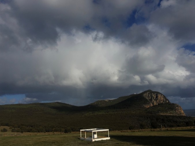 I just missed a fleeting rainbow between the two smaller hills. Clouds scudded by all day as squalls passed. We had 18 mm rain, which means part of the road to the jetty was covered in sand and part of the shoulder fell to the beach. In between showers, I shoveled, worked in the garden and walked to garden cove. Oh yes, and continued to weave on my backstrap loom, wove a kumihimo braid and worked on a sock. Leftovers for dinner!