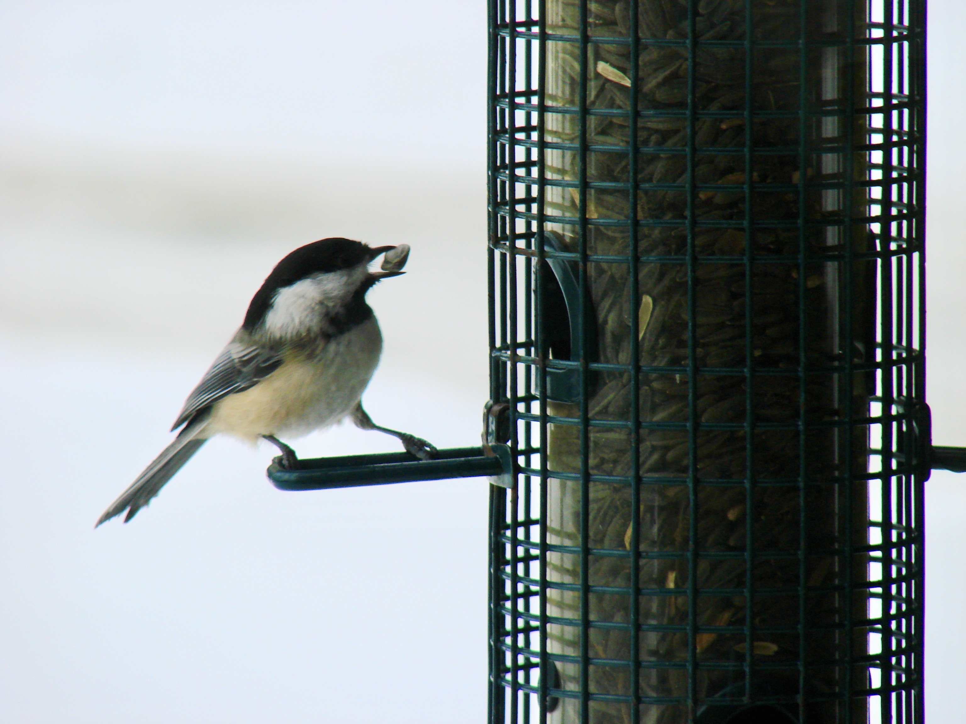 One bird often sits at the feeder and shovels out seeds for its buddies.