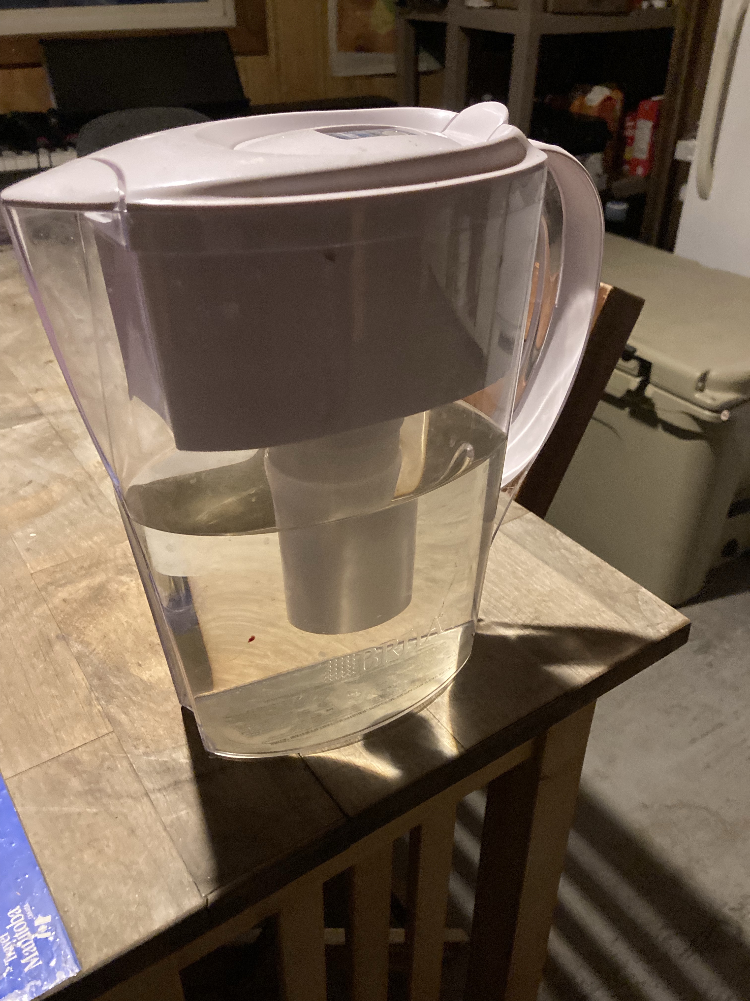 Last, back to the cabin where we used the water pump to transfer it to three indoor cisterns. From there, we have an electric pump that sends water to the faucets. We have an indoor filter and a Brita jug for the final filter.
