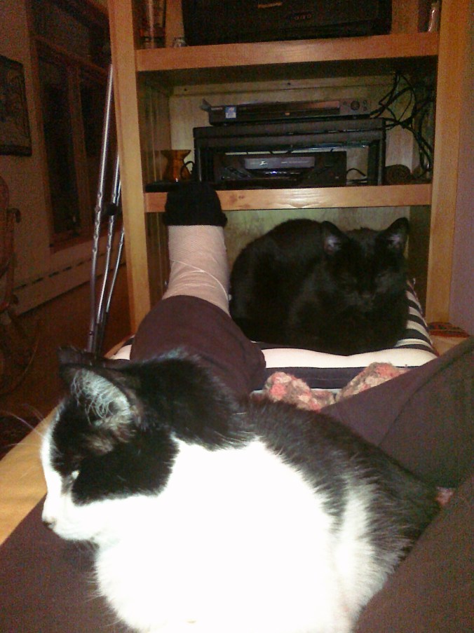 I think they may be using me as an excuse to lay around on the couches. It works for me. Neither one has come close to my cast or foot. Very strange how they seem to know. Tim’s taking good care of me but also said he’s ready (after one day) to invest in long term care insurance for me!