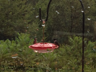 It’s finally spring in the Adirondacks. We have had plenty of April showers, in fact it has rained all May. The grass needed mowing and the birds are going wild. There are all sorts of feathered visitors at our feeders. Not so much the bird bath but maybe they are waiting for summer warmth. We have at least three ruby throated hummingbirds drinking our homebrew nectar (4:1 water to sugar). This morning, we saw a male perform a courtship dance, flying in a vertical arc, like a “U”, back and forth, over and over again. Then the female came to the feeder and drank primly. I’m not sure if he won her over. Here’s the male stoking up.