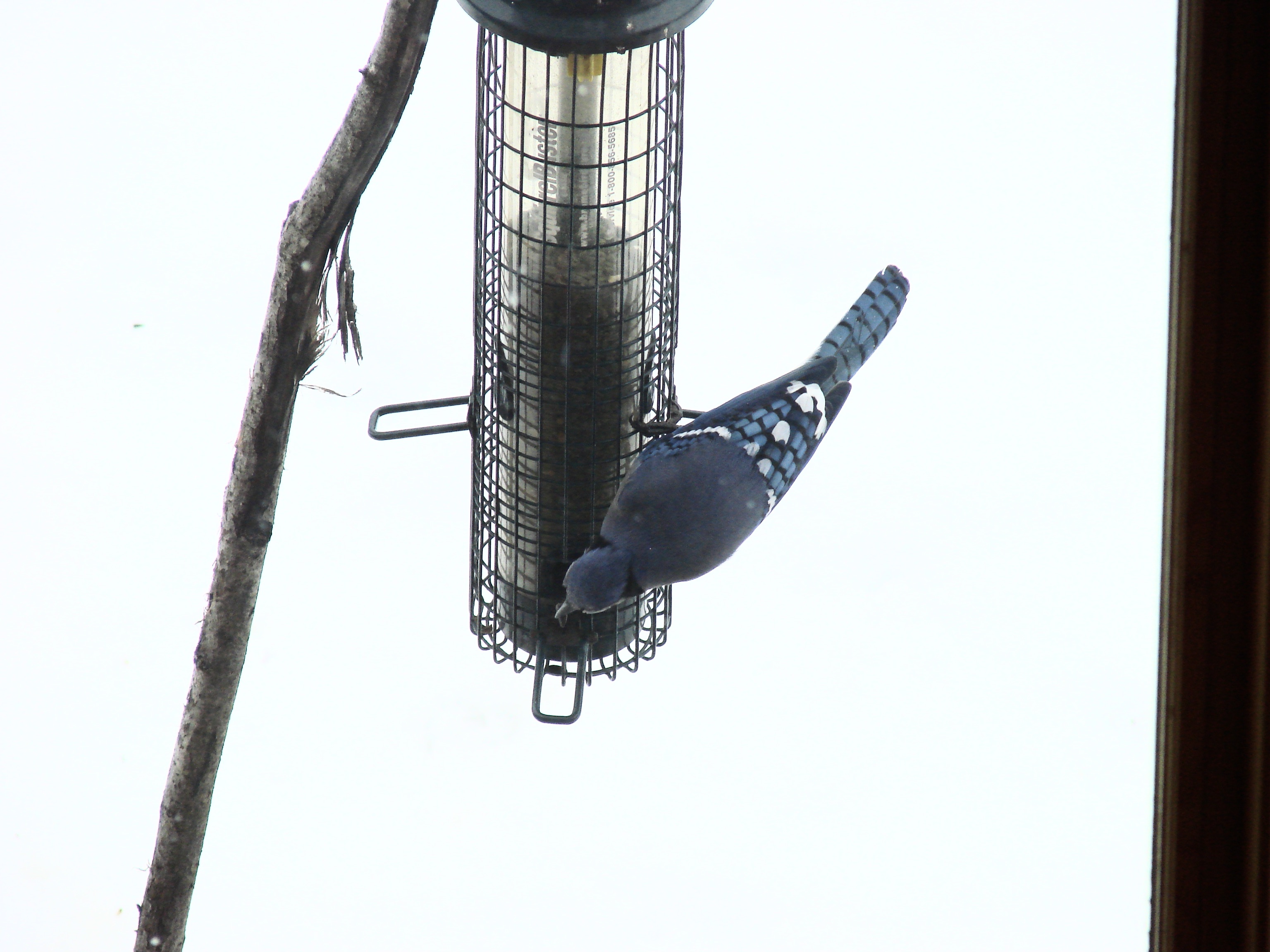 Blue jays and a female hairy woodpecker ate like birds at our feeders today. The blue jays are especially crafty. One pecks from above and makes a mess while another cleans up below. A pair of chickadees were flitting around and we only saw the tail end of a new arrival with a white belly and long tail. ID to follow if we ever see its head. It was hidden behind one of the feeders and ate for about 5 minutes. Even though we awoke to snow this morning, spring is definitely in the air. Just to prove it, we lose an hour of sleep tonight. It was too cloudy last night to see the Aurora Borealis but maybe today? I’m forever hopeful.