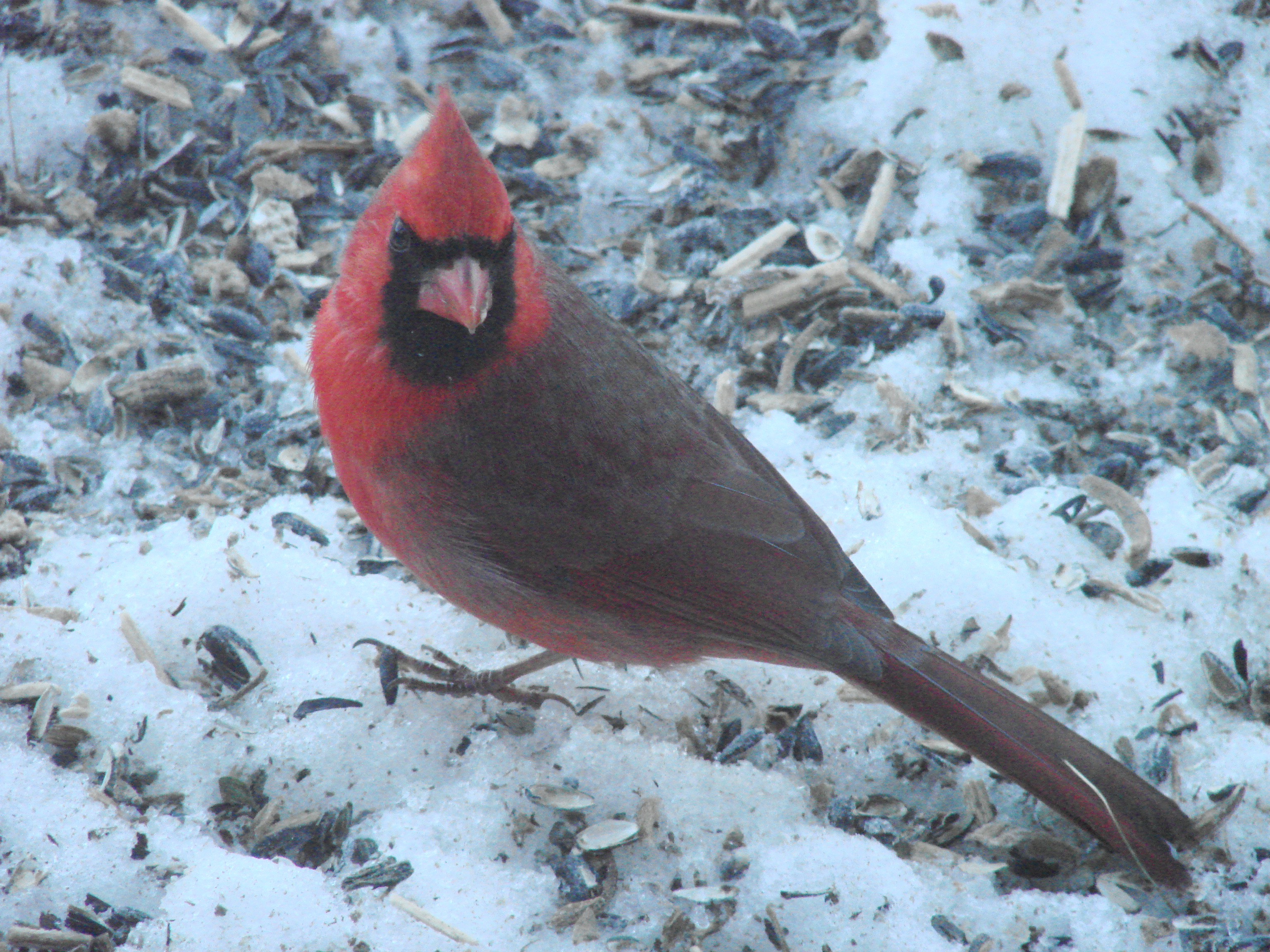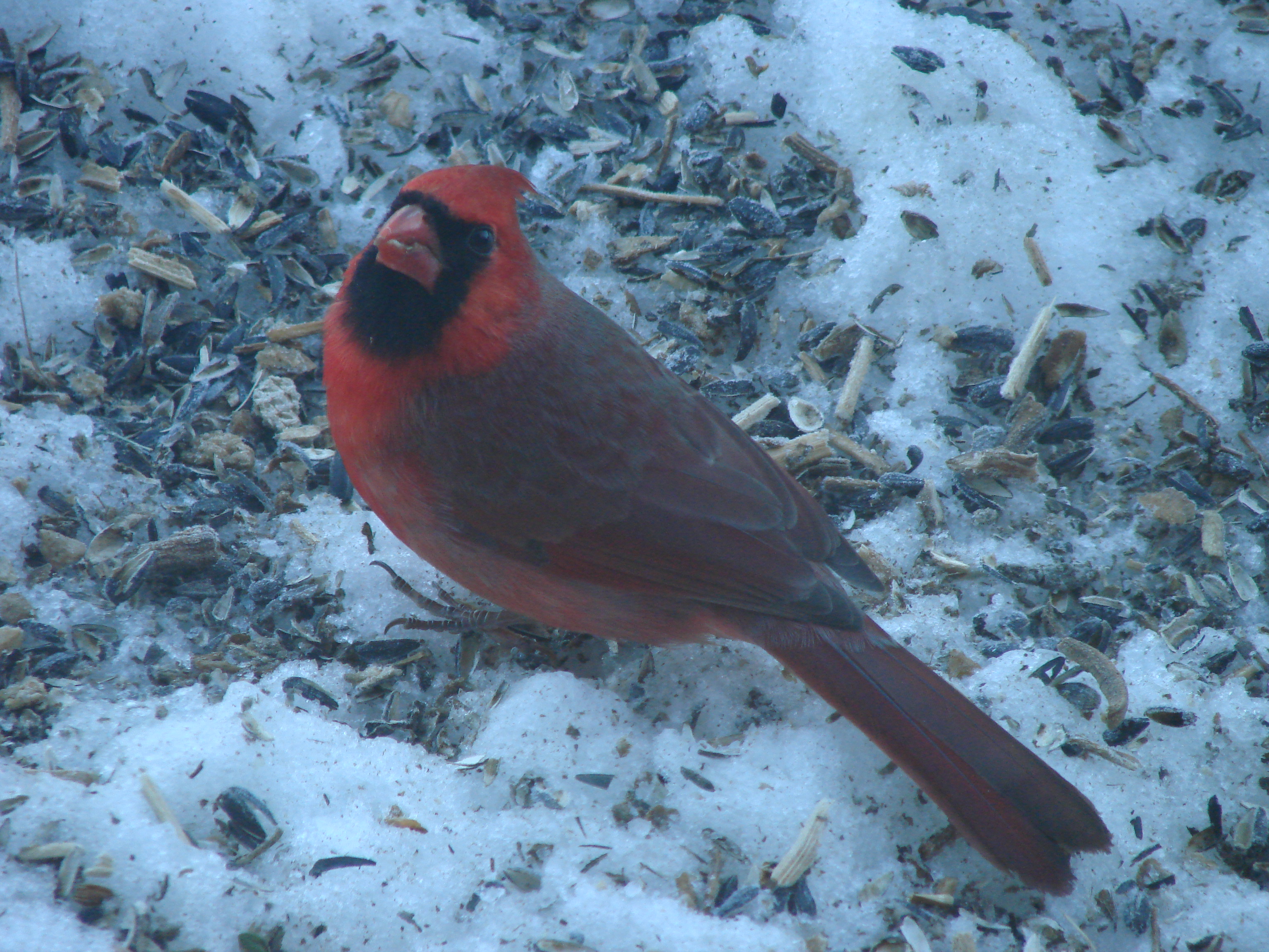 This morning, a male Northern Cardinal was hanging around and collecting the discards from the birds above. Both feeders are on very fragile limbs and only the Blue Jay is daring enough to try it.