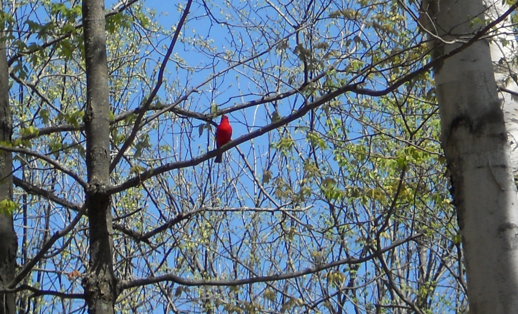 Yesterday, I enjoyed a walk with friends on a trail (not a track) led by naturalists on the Champlain Area Trail System (CATS). When we stopped chatting long enough to listen, we had lots of sites, plants and birds pointed out along the way. Here’s a red bird. It’s not a Beautiful Fire Tail or a European Goldfinch, or a Black Swan. It’s a Scarlet Tanager. It flew around the branches over our heads and belted out a beautiful song.