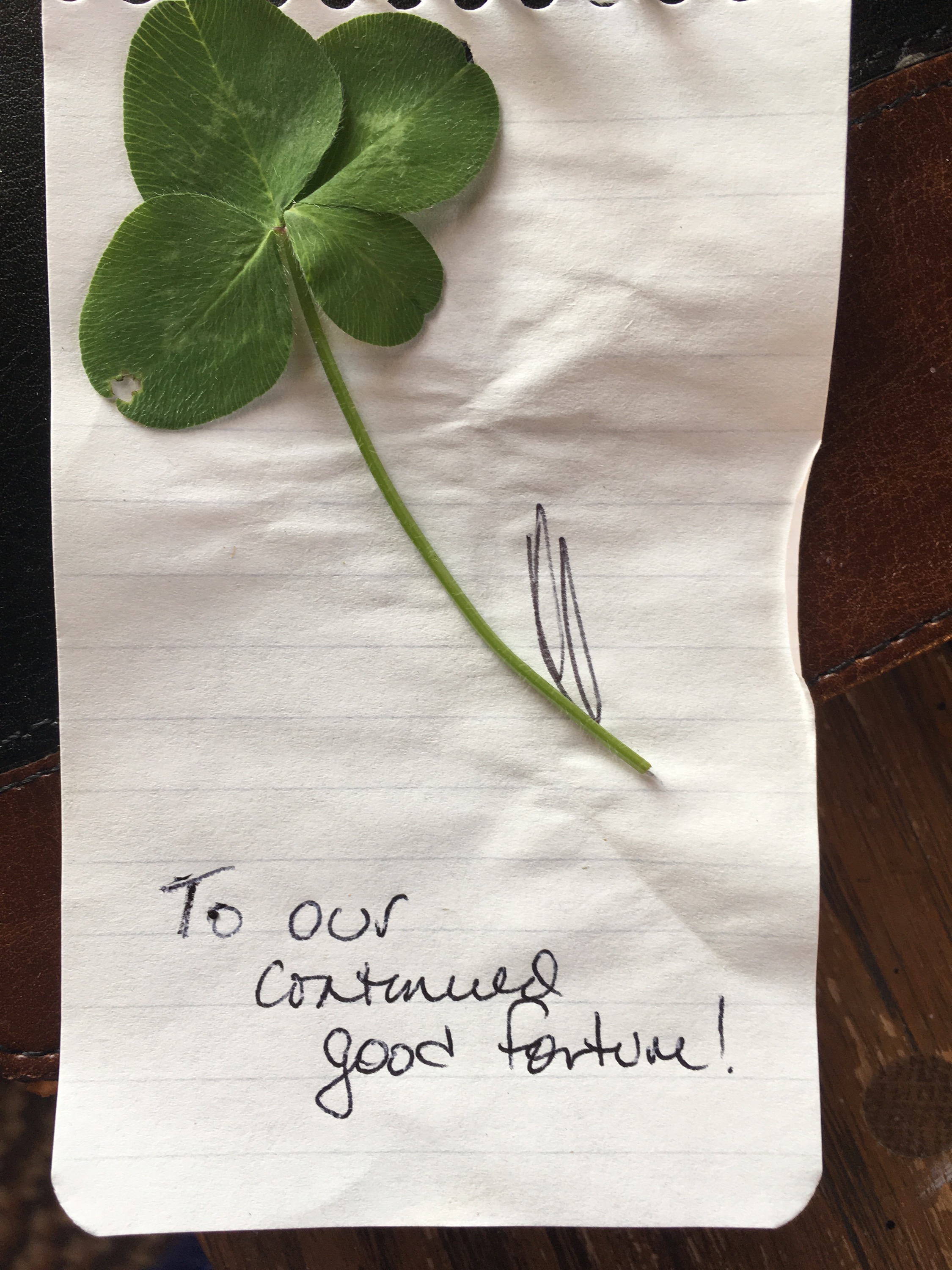 I researched four leaf clovers and the odds are in your favor to find them. I feel like I found dozens as a child but spent more time lying about and looking at the grass and clover. They occur about 1/10,000 but since clover grows so densely, there should be one in a 3′ x 3′ patch. So I spent a little time the past  couple of days, no more than 30 minutes, and found this lovely genetic mutation.