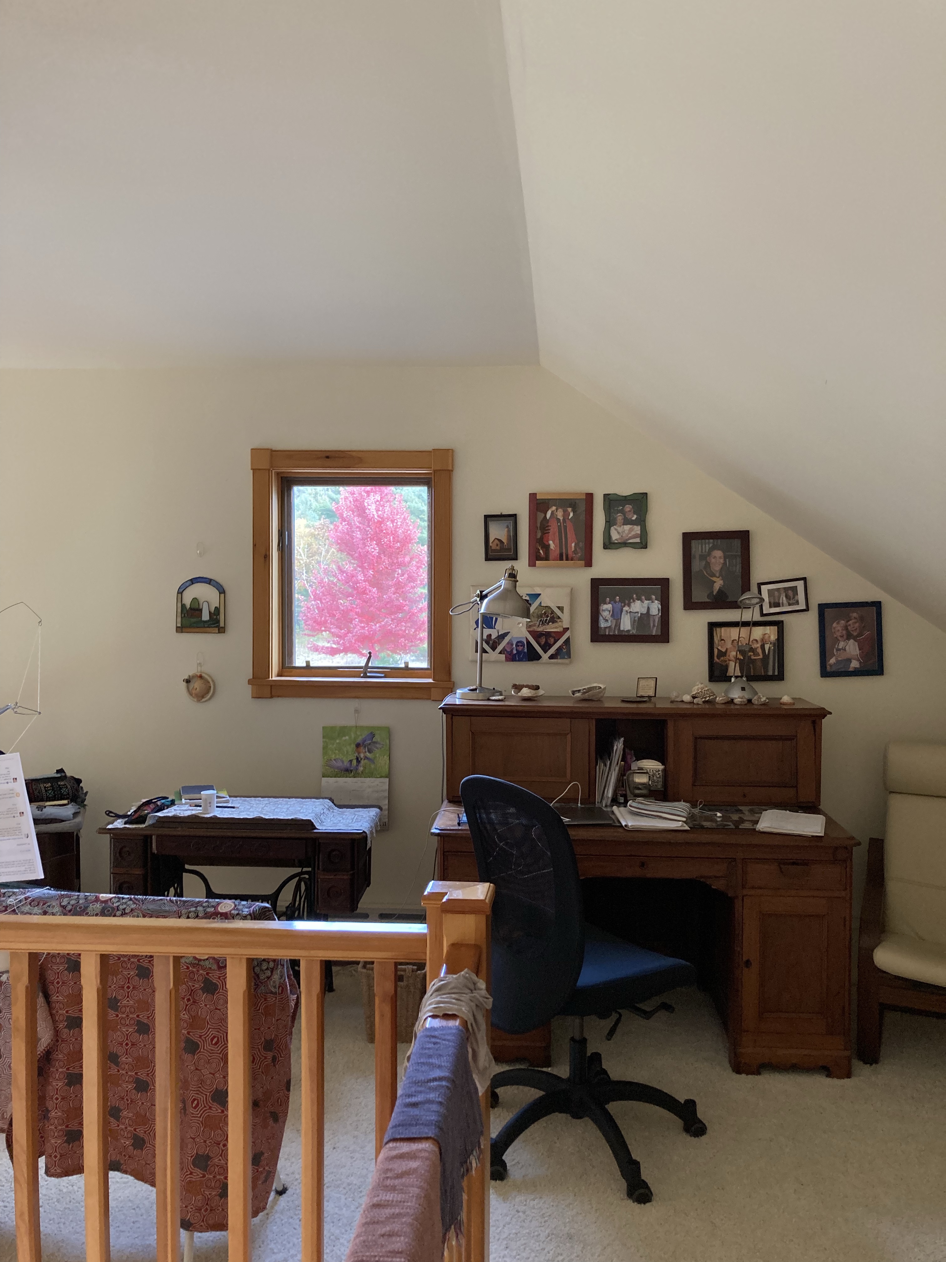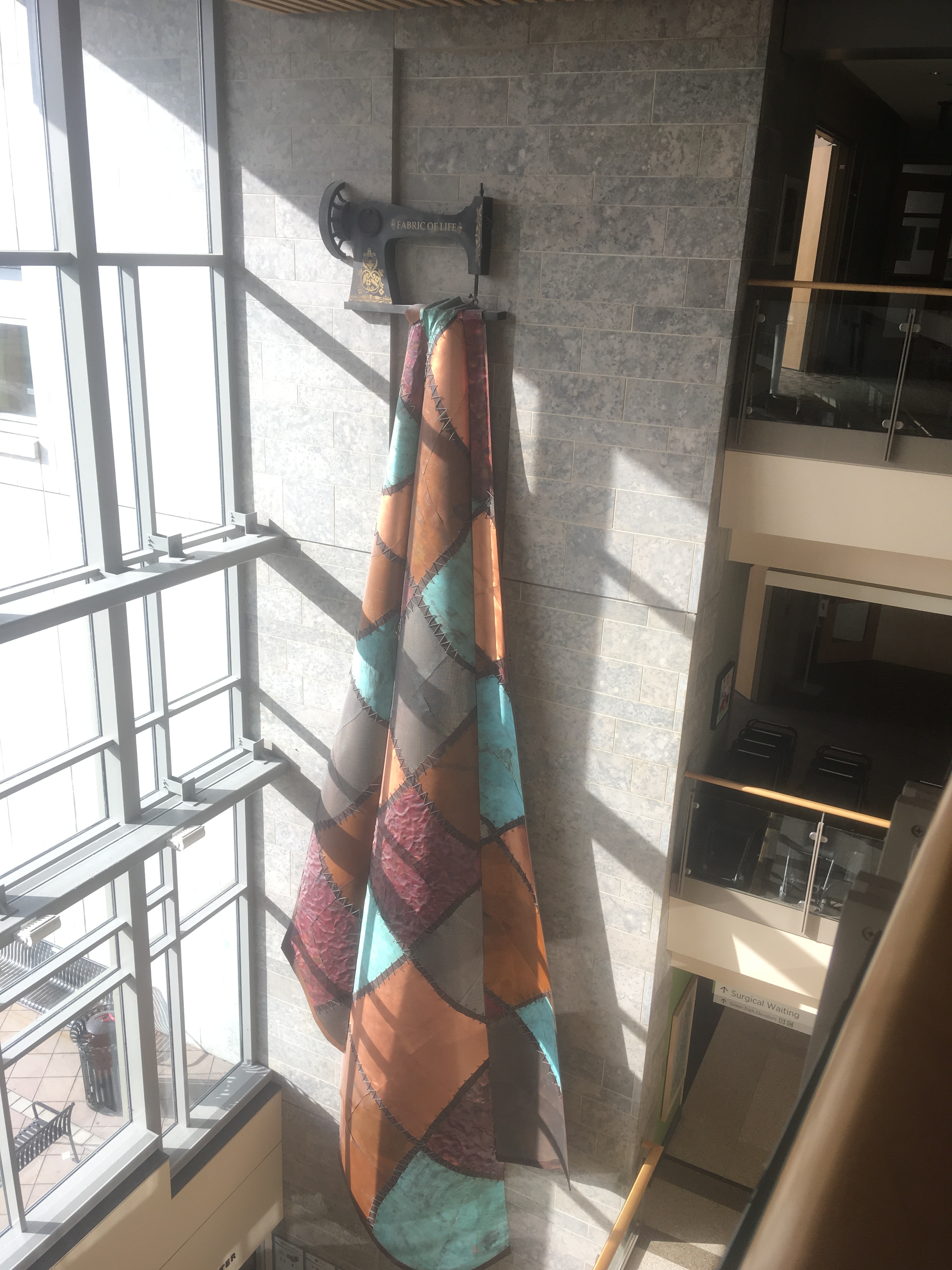 A trip to the University health center brought a surprise. A sculptured sewing machine and quilt, three stories high. Perfect fall colors.