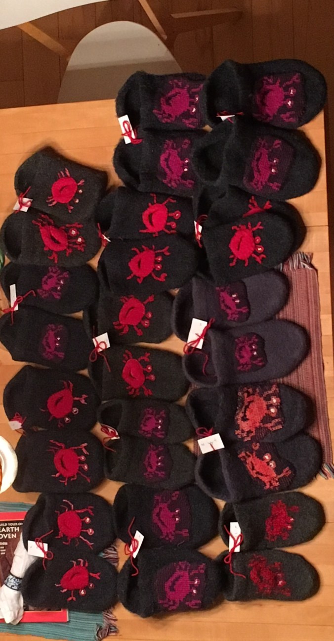 Basically everything. I’ve been on a knitting and felting kick lately. I finished the slippers for my daughter AND HER 13 FRIENDS! She wanted their crab logo on them and I tried all sorts of techniques to make crabs: cross stitch; felted appliqué; and knit. I used BigPhil, my bulky knitting machine to knit the clogs flat, sewed them together and felted them in the washer. Then I embellished them with various crabs.