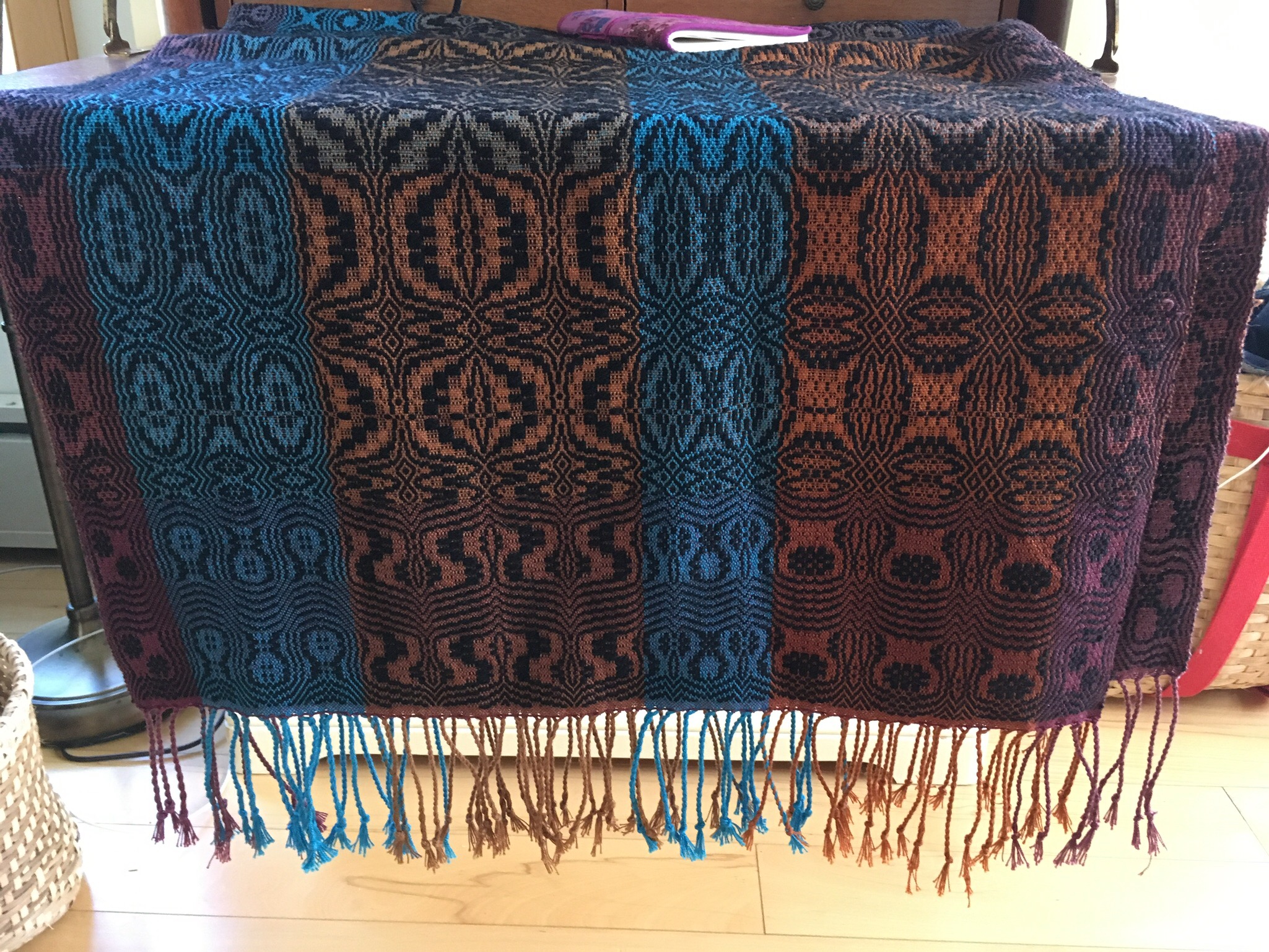I have a few more slippers up my sleeve but have moved on to weaving. I finished twisting all the ends to my lovely overshot sampler shawl this morning.