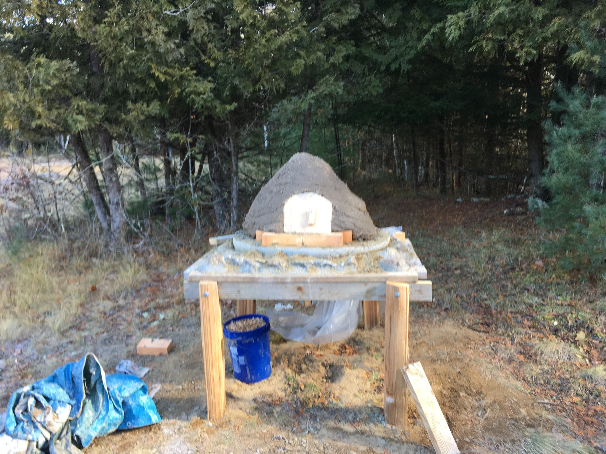 My earth oven has been shelved until the spring. I spent a day last weekend building the form with sand then covering it with mud. It looked great but I made the cardinal mistake of not sampling the clay enough. When I shoveled out the 3 wheelbarrowfulls of sand and lit a fire within, the roof collapsed as the too-wet clay mixture defrosted.