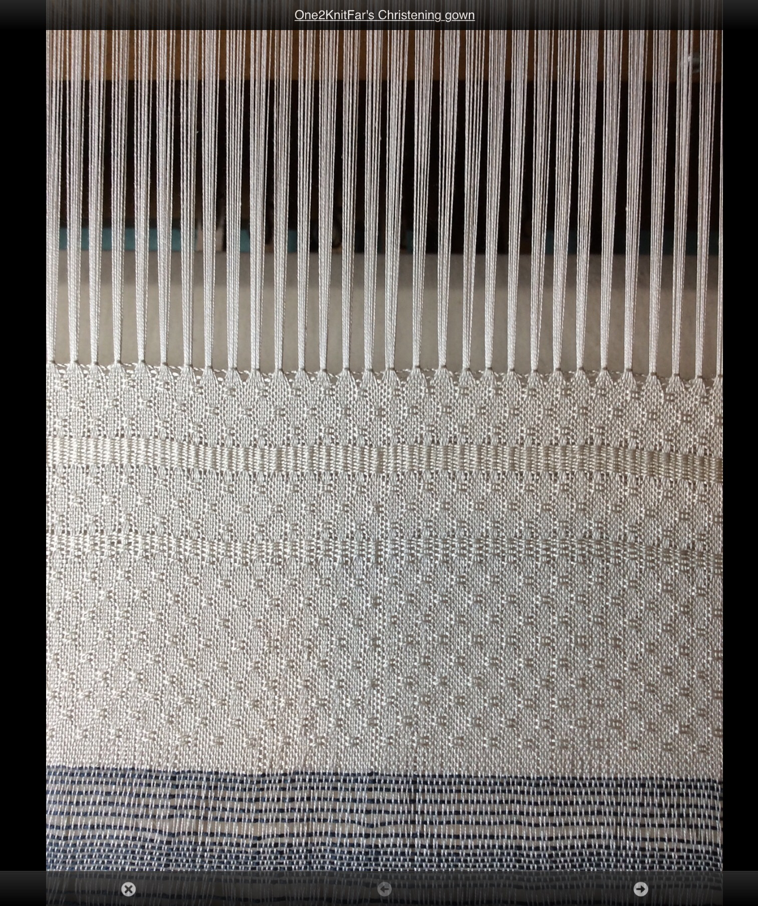 Then I got to real work. I am making my new grandson’s christening gown from a Handwoven pattern. 724 ends of fine 20/2 cotton. I was able to warp 3 threads at a time (I used a rigid heddle clamped to the table as a warping paddle) and it was a breeze. A few of those threads snapped while getting it on the loom but after a morning repairing broken threads I was off and weaving. I’m using fine silk as the weft and it is stunning.