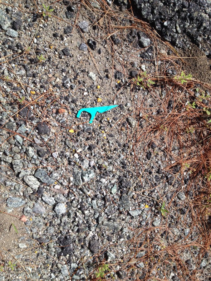 I believe in flossing, but in the privacy of your own home, preferably in the bathroom with the door closed. Why do these turn up on the street in some of the most beautiful places in the world. The first time I saw one was on the street in the island country, Dominica. Now they follow me whereever I run. I see one almost daily. Yesterday at least I found a beautiful turkey feather too.