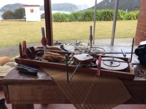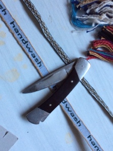 I found a zinc washer to work as a buckle and my pants haven’t fallen down yet. I tie my backstrap loom to the crank on the hoist clothes line. The spinning clothes line was invented in Australia and it’s a marvel. On windy days, it twirls with the wind and clothes dry in an hour!