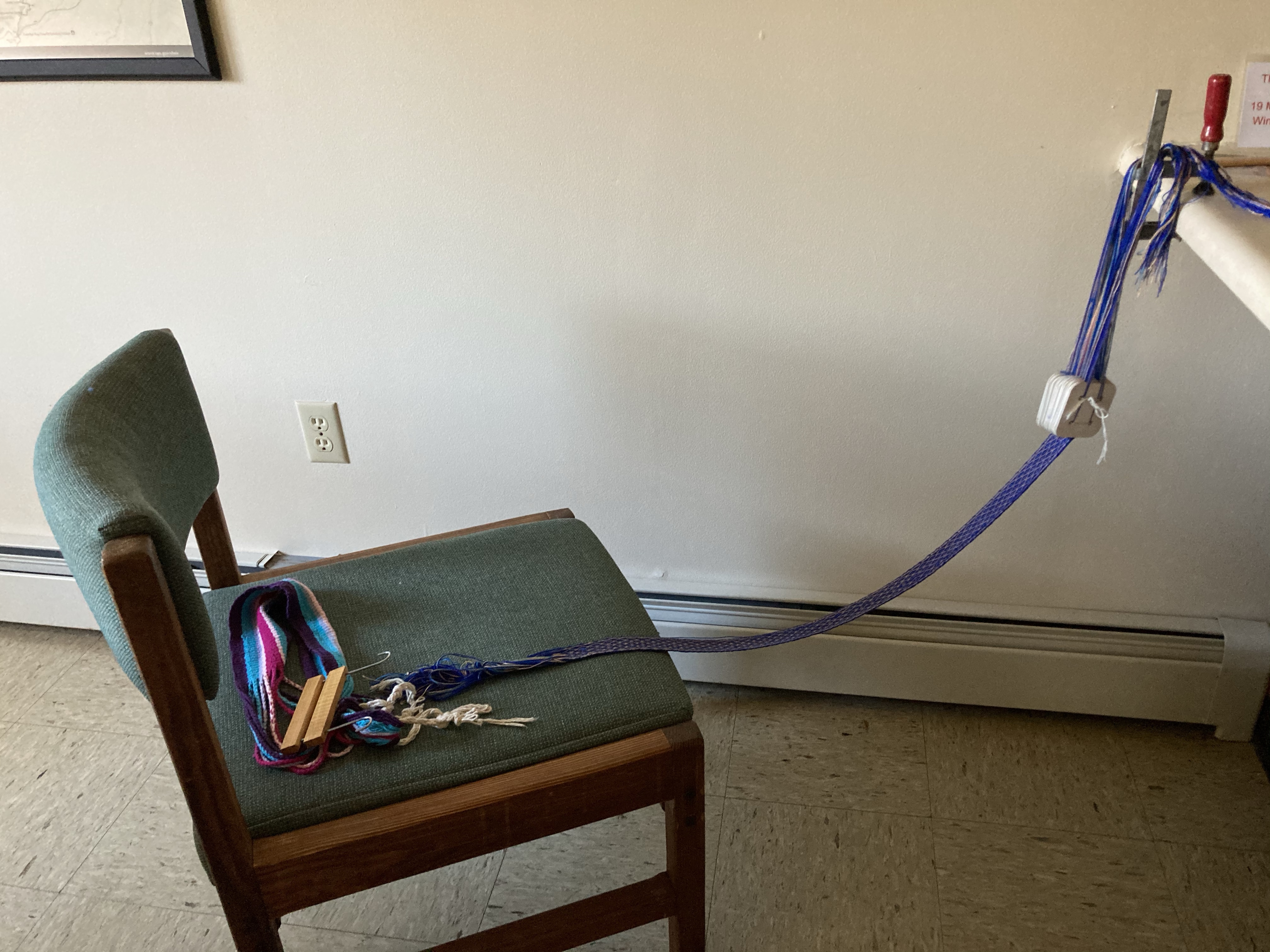 This ties me to the coffee table leg. I also turn the table on its side and use it as a warping board to measure and organize the warp threads.